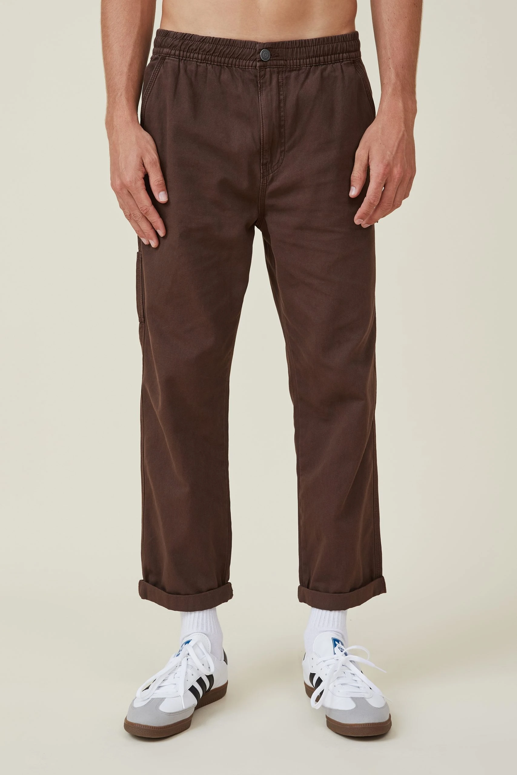 Elasticated worker pant is a casual draw string waist style with workwear detailing and a wider leg profile.