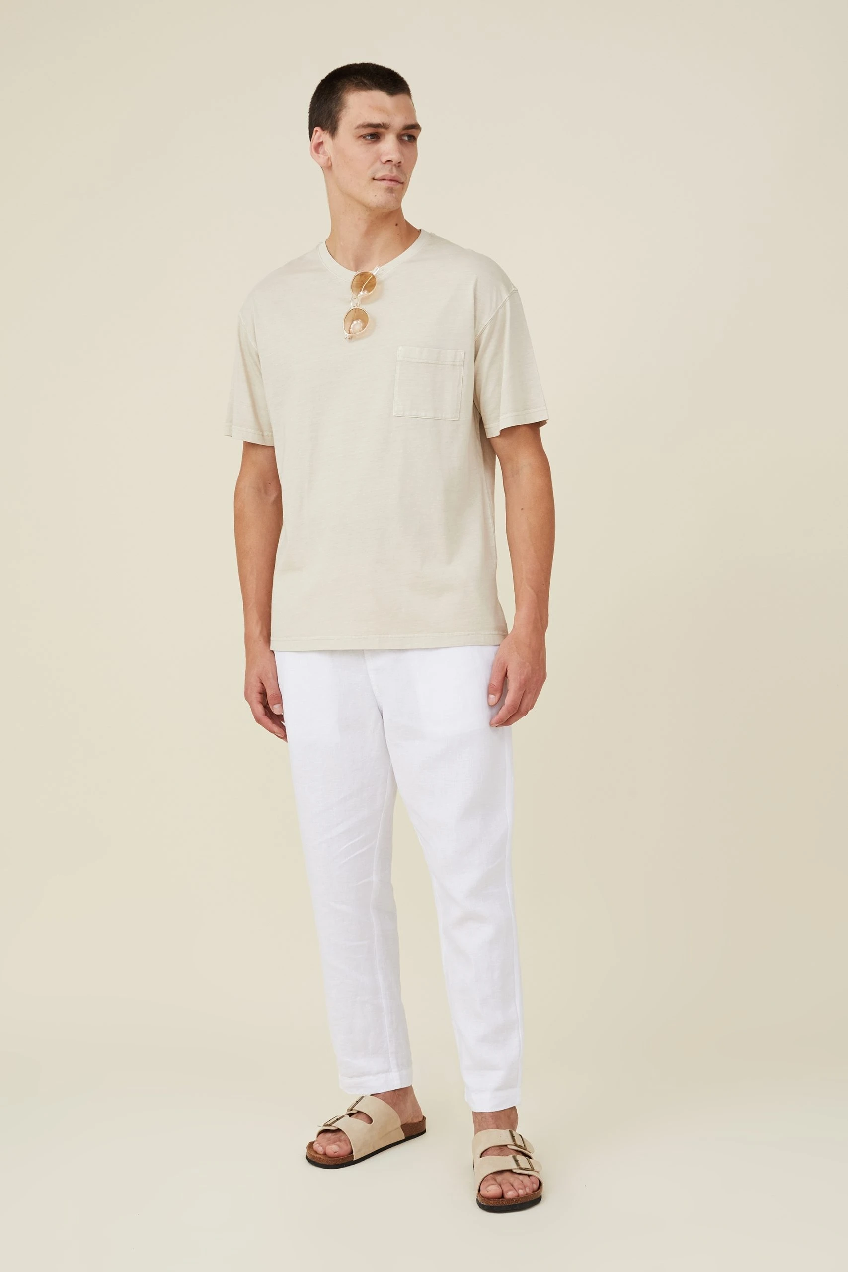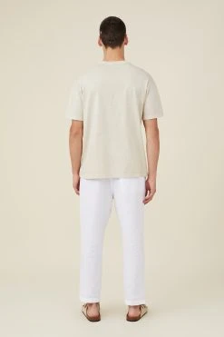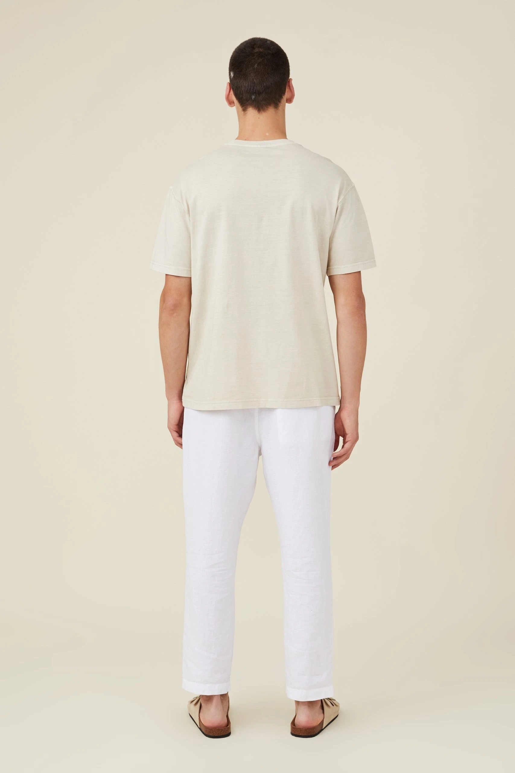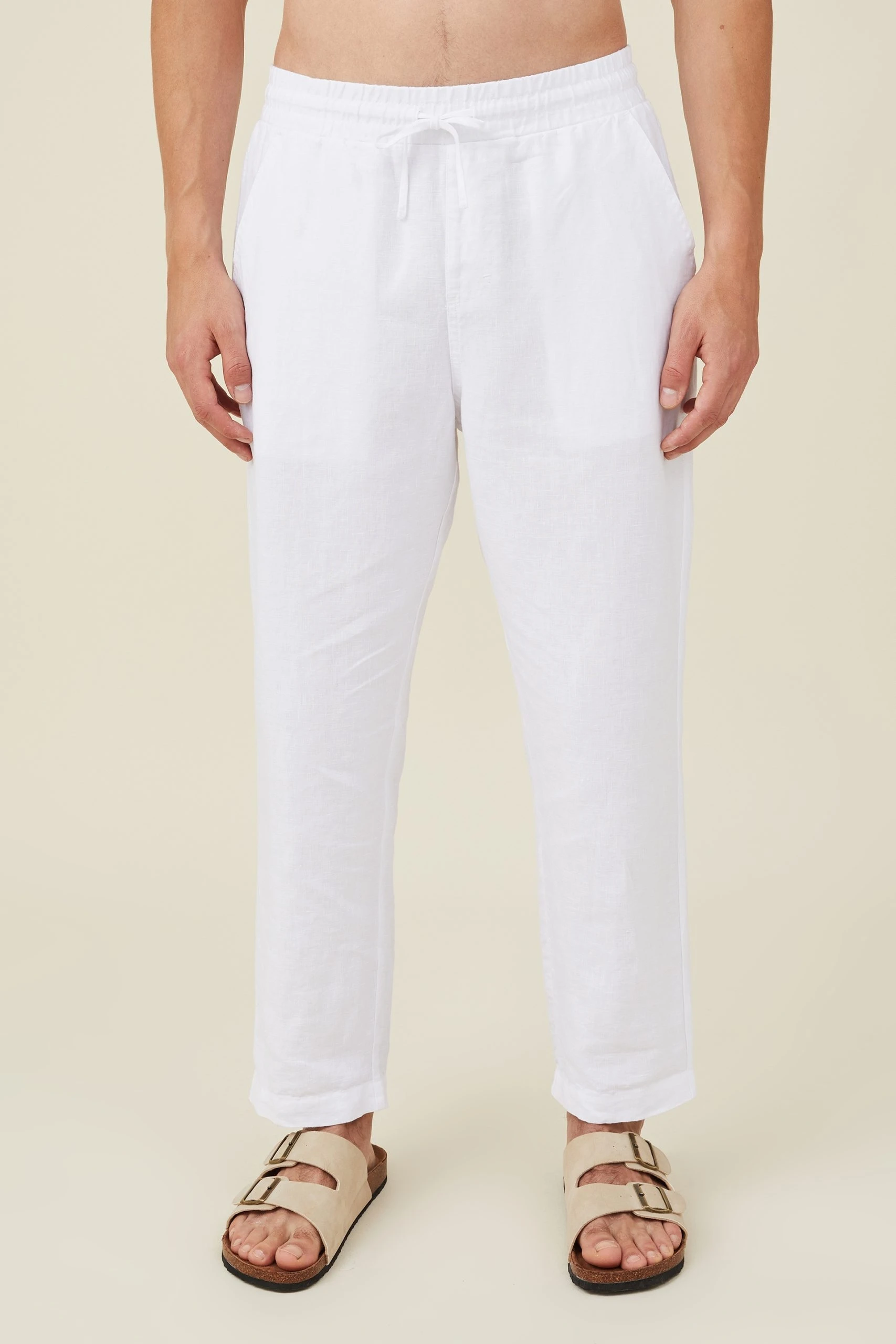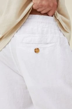 Textured Woven Linen – Relaxed Fit – Elasticated Waistband With Drawcord – Front Side Pockets – Single Back Pocket With Detail Button Closure